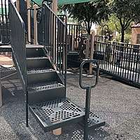 The steps and platform leading up to one of the elevated play structures.