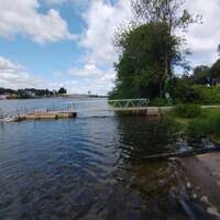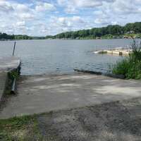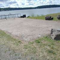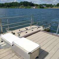 View from trailered boat launch dock of kayak launch, pier and gangway.