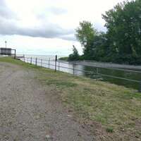 View of fishing access dock and accessible parking pad with metal railings with lower cutout rails. Water and trees in background.