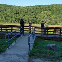 Marshes and water with railroad tracks in foreground and hills with trees in background.