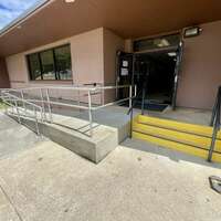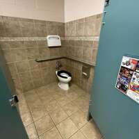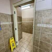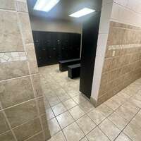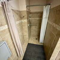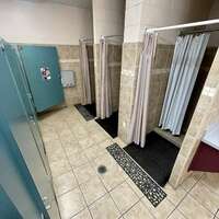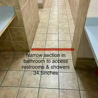 The locker room last shower on the right is the most accessible but has a narrow opening in the back of 35 inches