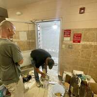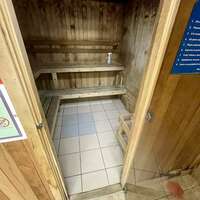 The steam room is not complete but seems to be more inclusive than the sauna. It does not seem to have grab bars scheduled to be installed, the door will have a pull bar, 34" opening, is a zero entry, benches are 18" high x 22" deep and there is a minimum 60" circumference inside to maneuver